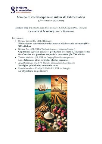 Dans le cadre de l'initiative "Alimentation", développée au sein de l'Alliance Sorbonne Université et dont CLEA est partie prenante, Béatrice Perez présentera une communication lors du séminaire ayant pour thématique "Le sucre et le sucré", le mercredi 15 mai 2025. L'ensemble des communications sera, sans aucun doute, passionnant!